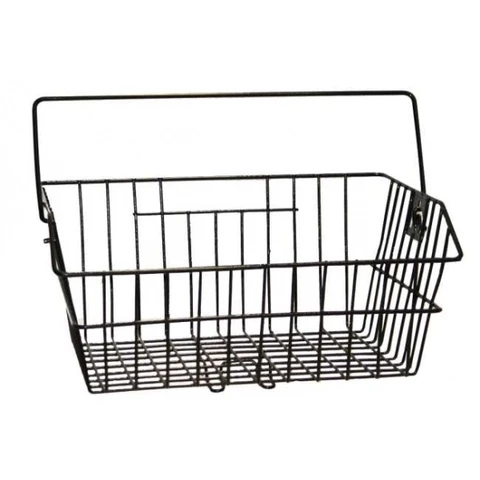 Tukeva muovitetusta teräslangasta valmistettu kantokahvallinen kori tavaratelineelle.